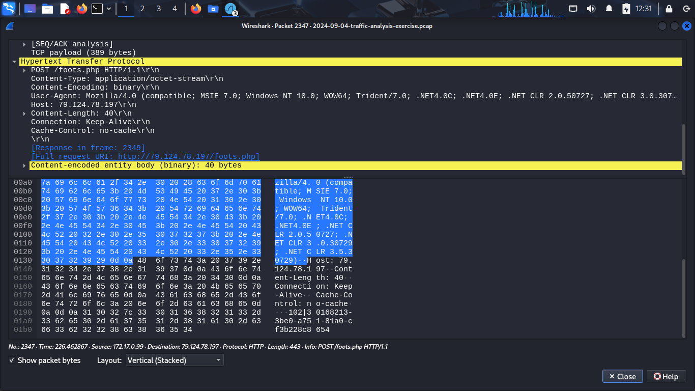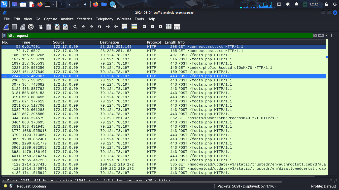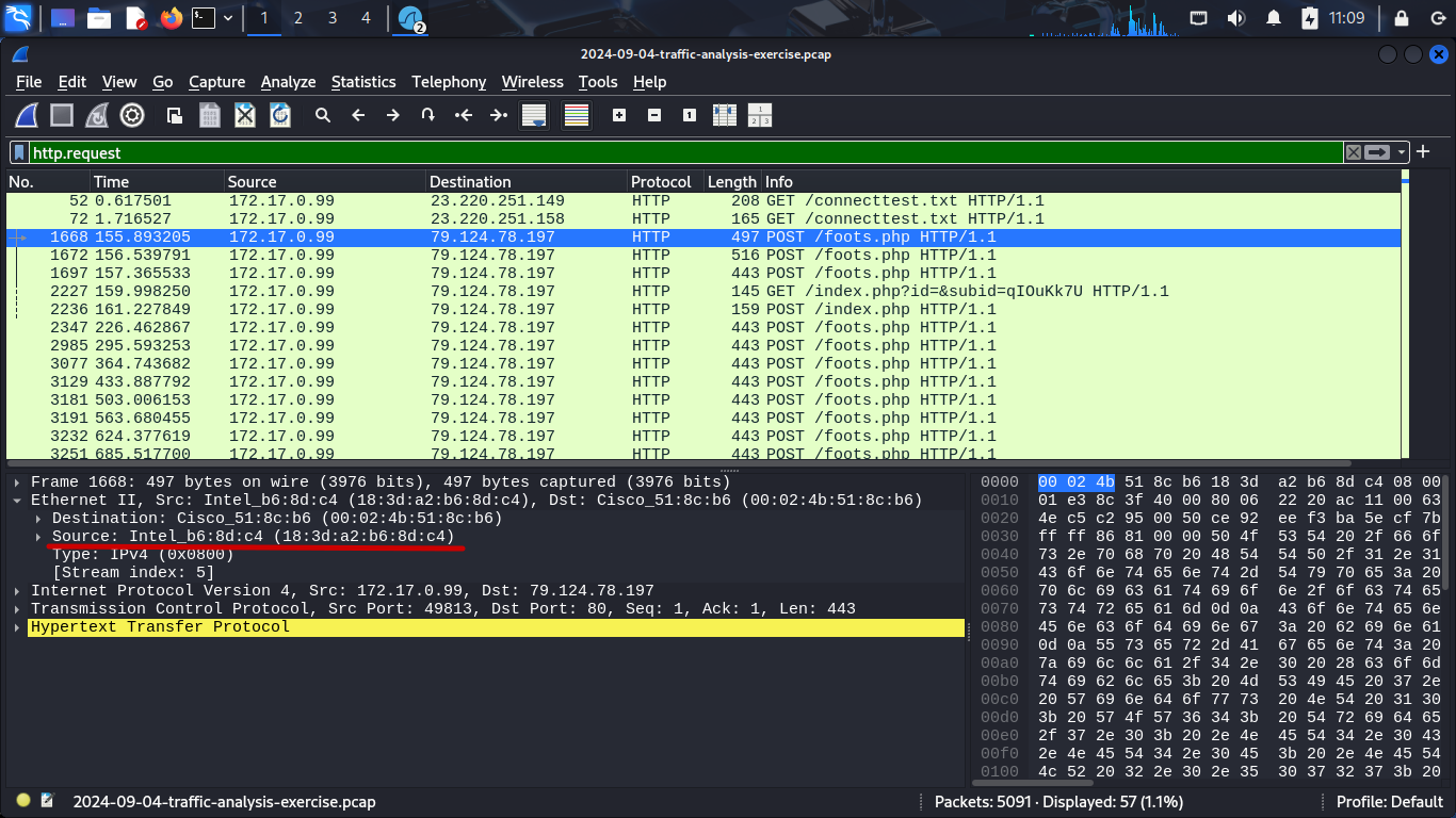Pada file 2024-09-04-traffic-analysis-exercise.pcap, terdeteksi permintaan HTTP POST dalam jumlah banyak dari host internal 172.17.0.99 ke IP eksternal 79.124.78.197 menuju endpoint /foots.php.