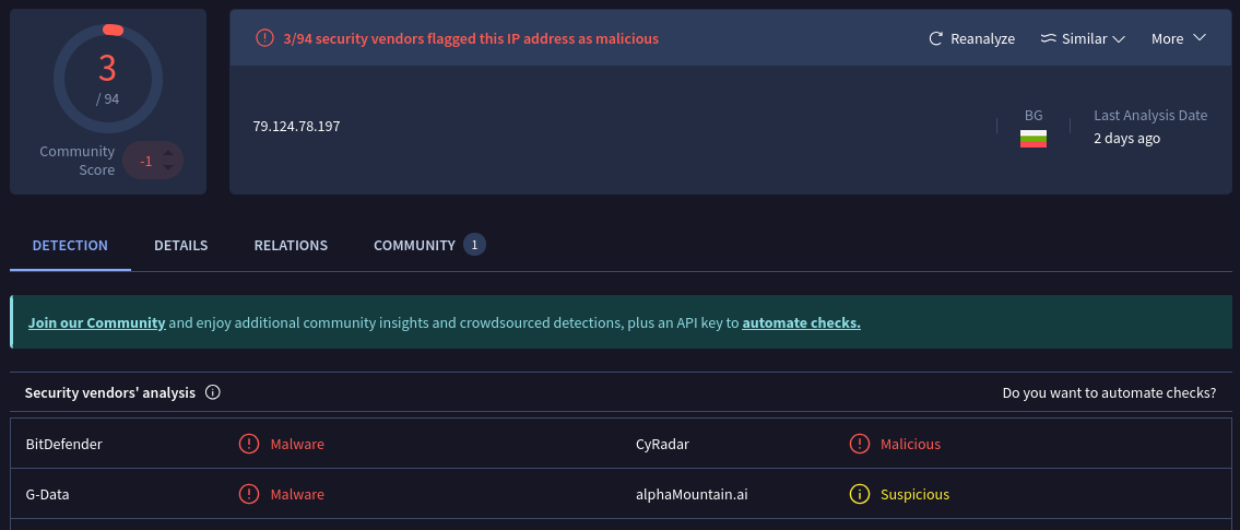 - VirusTotal IP Reputation: https://www.virustotal.com/gui/ip-address/79.124.78.197