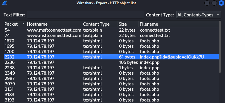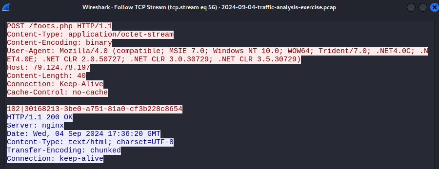 Menariknya, permintaan ini ditujukan ke endpoint foots.php, yang ditulis menggunakan PHP. Penggunaan PHP sebagai endpoint merupakan taktik yang cukup umum dalam komunikasi malware atau web shell, karena PHP dapat dengan mudah menangani permintaan dan respons secara dinamis, baik untuk menerima perintah maupun mengirimkan hasil curian ke attacker.