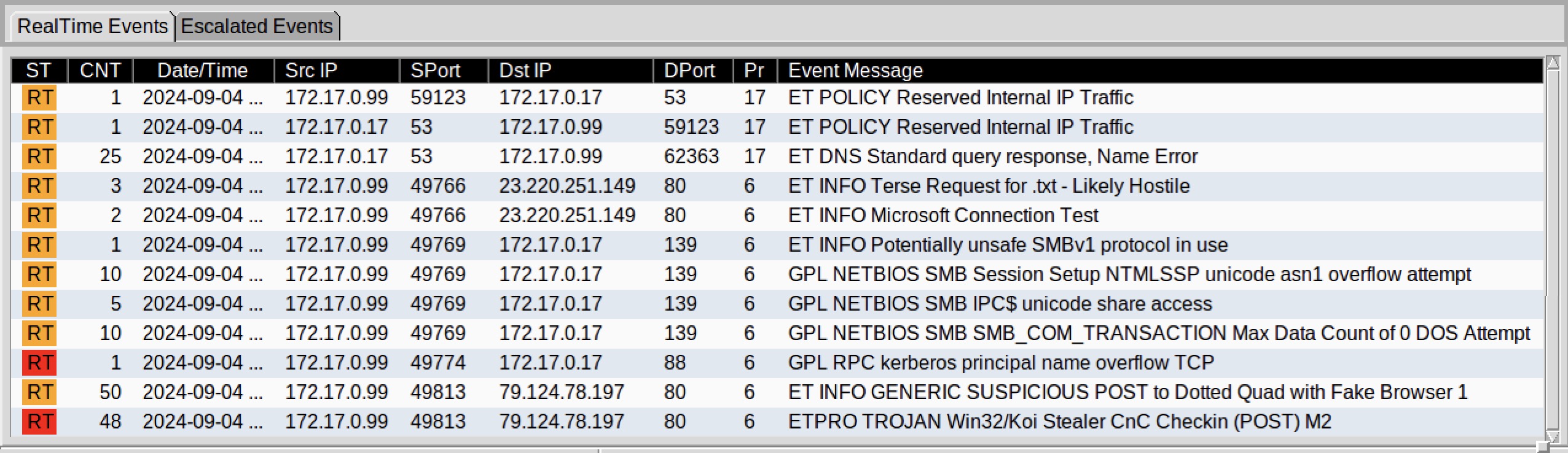 | Kemungkinan Infeksi | Dikonfirmasi | Host `172.17.0.99` mengirim HTTP POST ke IP eksternal berbahaya dan terdeteksi oleh signature malware Koi Stealer. |