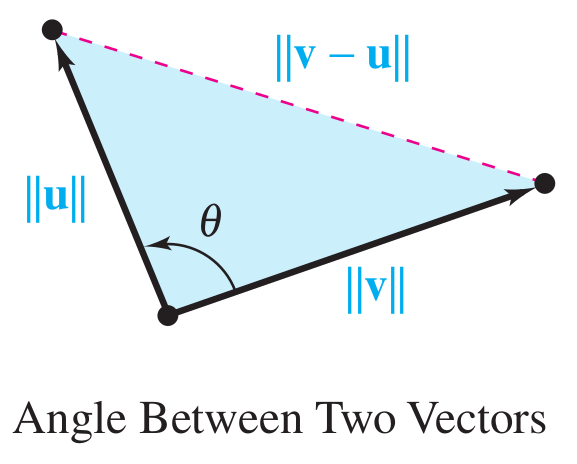 \[\require{cancel} \begin{align} \lVert \mathbf{v} - \mathbf{u} \rVert^2 &= \lVert \mathbf{u} \rVert^2 + \lVert \mathbf{v} \rVert^2 - 2 \lVert \mathbf{u} \rVert \lVert \mathbf{v} \rVert \cos \theta \\ \Longleftrightarrow (v_1 - u_1)^2 + (v_2 - u_2)^2 &= u_1^2 + u_2^2 + v_1^2 + v_2^2 - 2 \lVert \mathbf{u} \rVert \lVert \mathbf{v} \rVert \cos \theta \\ \Longleftrightarrow \cancel{v_1^2} - 2 v_1 u_1 + \cancel{u_1^2} + \cancel{v_2^2} - 2 v_2 u_2 + \cancel{u_2^2} &= \cancel{u_1^2} + \cancel{u_2^2} + \cancel{v_1^2} + \cancel{v_2^2} - 2 \lVert \mathbf{u} \rVert \lVert \mathbf{v} \rVert \cos \theta \\ \Longleftrightarrow u_1 v_1 + u_2 v_2 &= \lVert \mathbf{u} \rVert \lVert \mathbf{v} \rVert \cos \theta \\ \Longleftrightarrow \cos \theta &= \frac{u_1 v_1 + u_2 v_2}{\lVert \mathbf{u} \rVert \lVert \mathbf{v} \rVert}. \tag{1}\label{eq:final-eq} \end{align}\]Pembilang dari pecahan di ruas kanan dari Persamaan \eqref{eq:final-eq} merupakan hasil kali titik (dot product) dari $\mathbf{u}$ dan $\mathbf{v}$ sehingga Persamaan \eqref{eq:final-eq} dapat ditulis menjadi